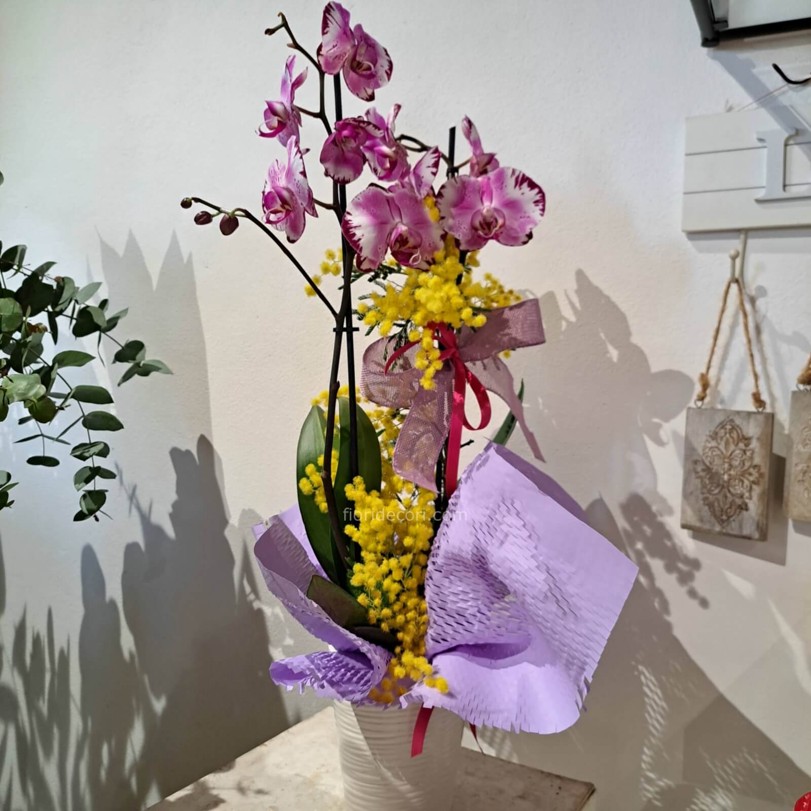 Phalenopsis con vaso e mimosa